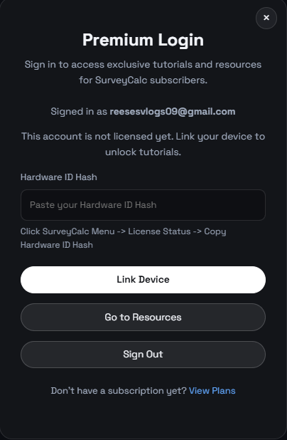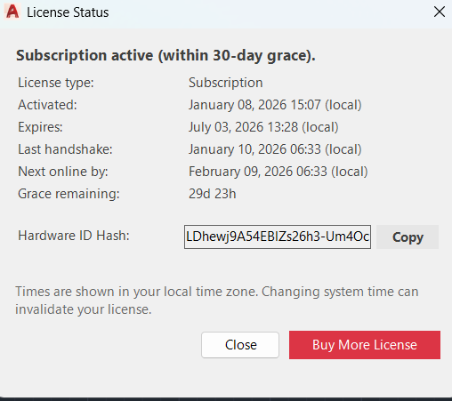 - In AutoCAD, go to SurveyCalc -> License Status and click the Copy button to copy your Hardware ID Hash.